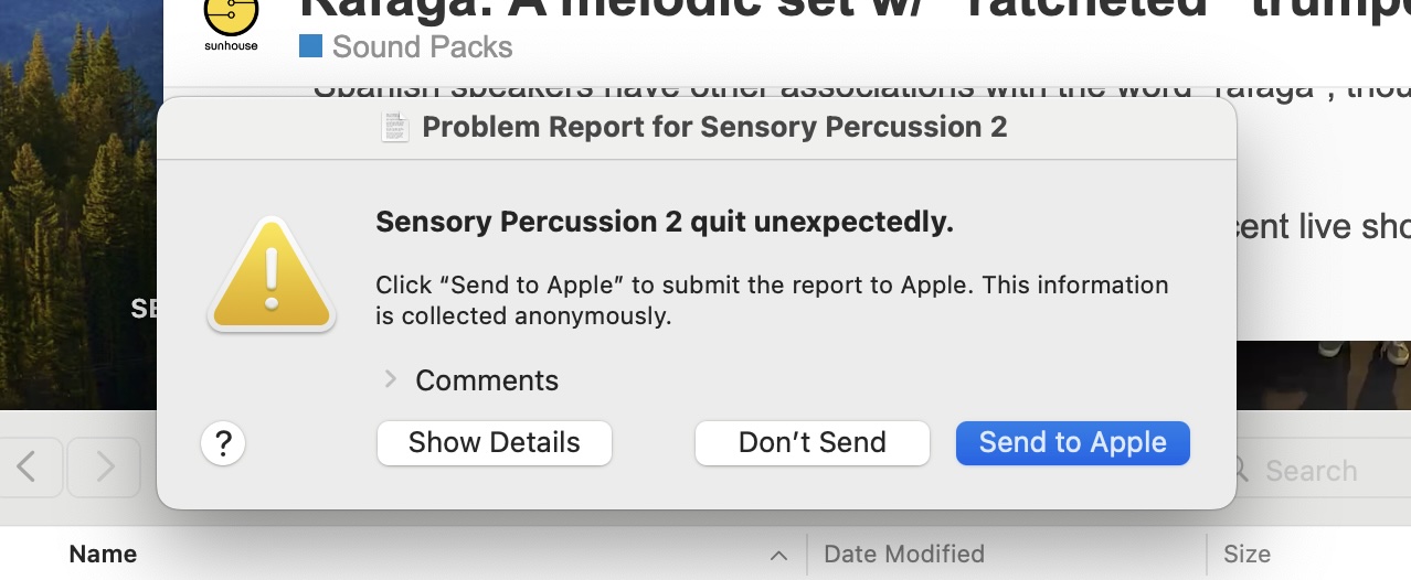 After manual “Quit” action, I see very often this error message “Sensory Percussion 2 quit unexpectedly.”