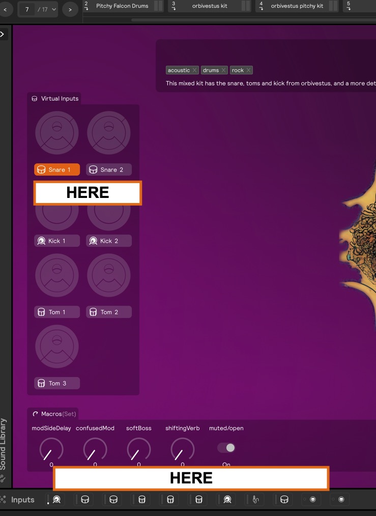 Instead to move macros section, It can be useful to double-click or right-click on drums label (like the orange “SANRE" 1” in the picture below) and/or on mini drums (if lower drums bar is collapsed)